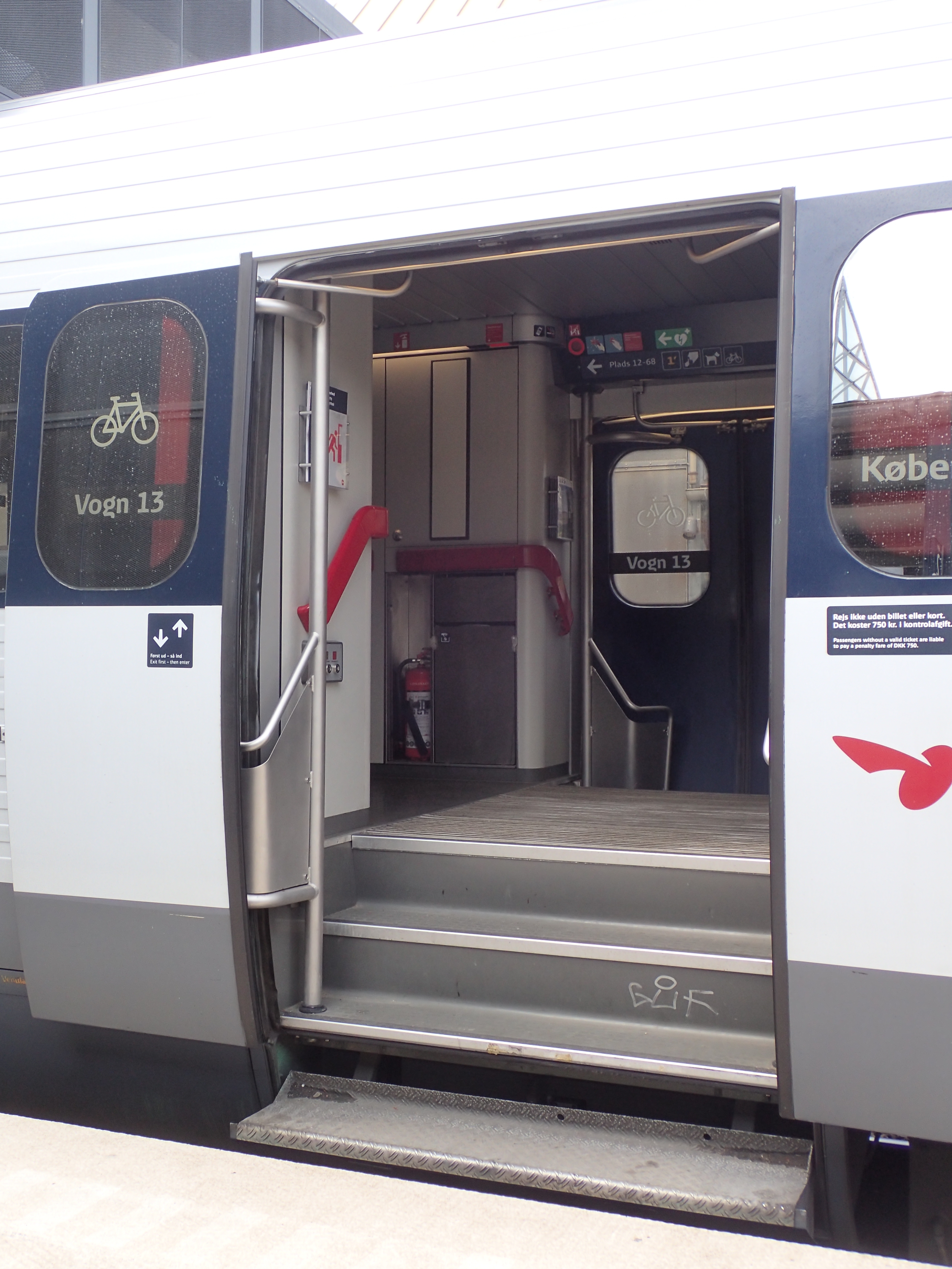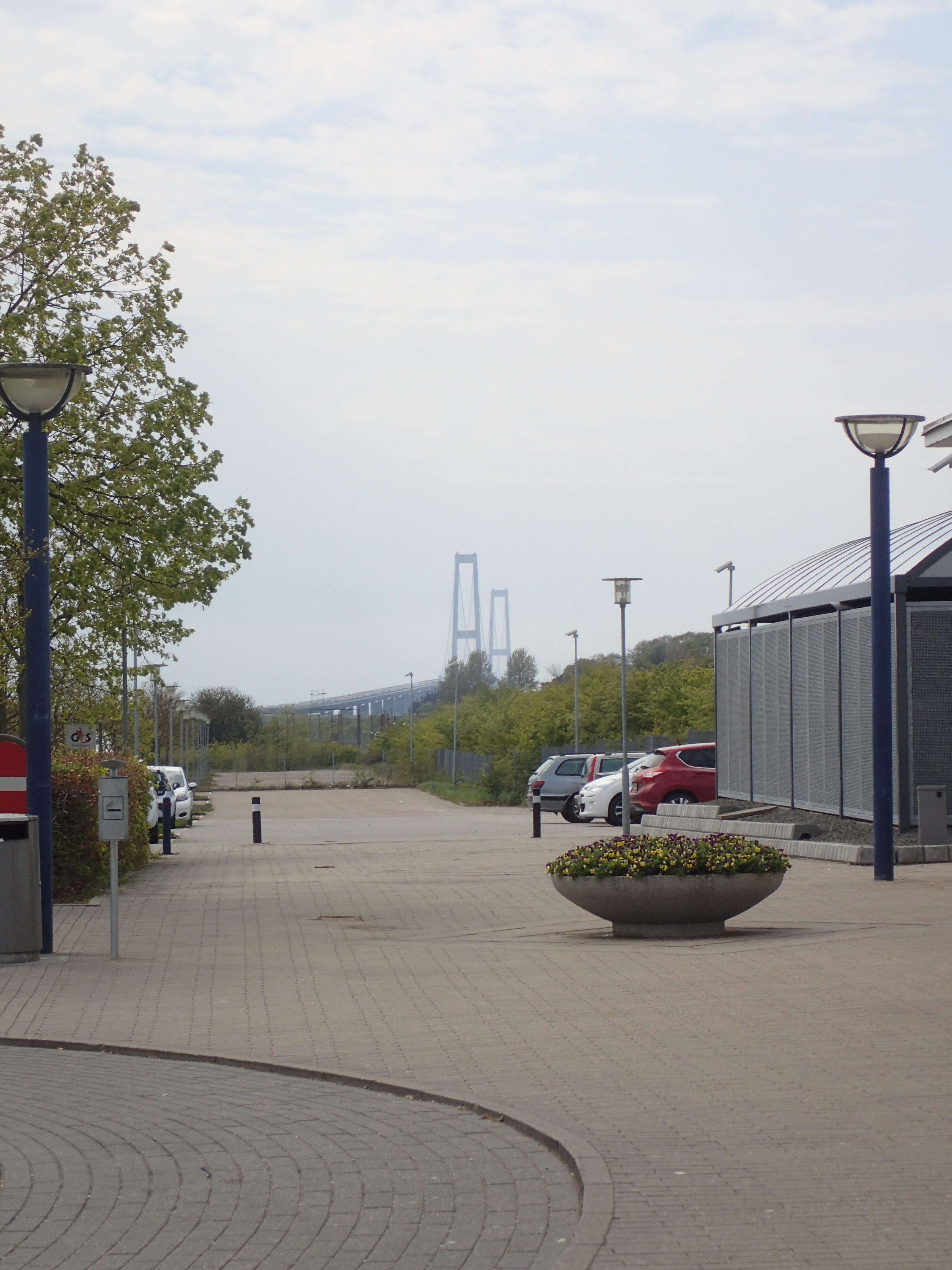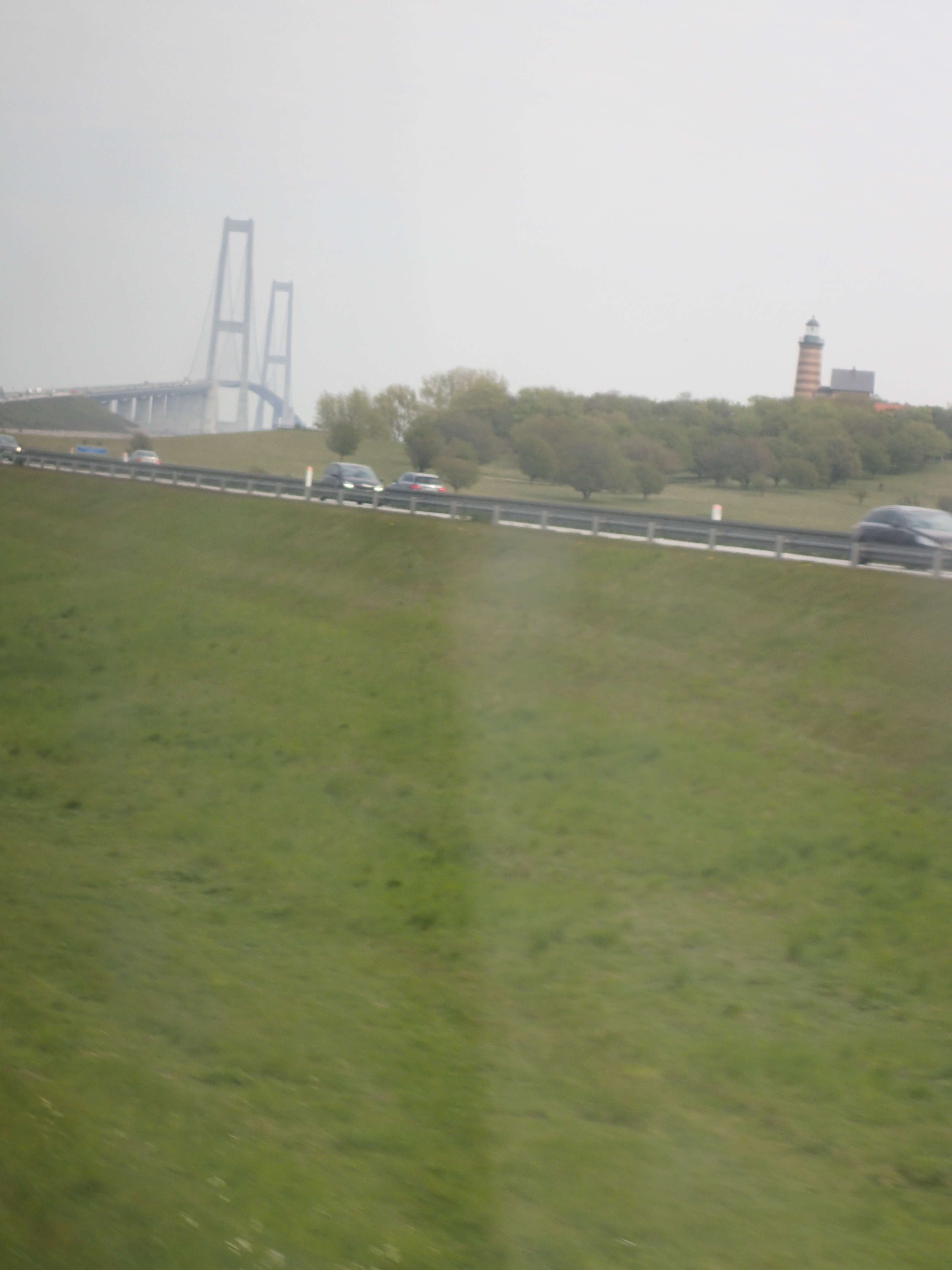 Heute sollte es zwar kaum regnen, aber der Wind sollte mit 4-5 Bft direkt aus Ost wehen. An der aufgezeichneten Route ist zu erkennen, dass ich den ganzen Tag den Wind im Gesicht hatte. Es war wechselnd bewölkt, der Wind war aber eisig. Hinzu kamen die vielen kleinen Anhöhen sowohl auf Fyn als auch auf Sjælland. Ich kam überhaupt nicht voran, es war heute besonders anstrengend. Das würde ich nicht für den Rest der Reise durchstehen. Dann am Bahnhof Nyborg (ich wusste bereits von meinen Vorbereitungen, dass ab Mai Fahrradplätze im Zug reserviert werden müssen) am Fahrkartenautomaten habe ich die Hotline angerufen. Zur Wahl standen Dänisch und Englisch als Sprache. Die telefonische Reservierung und der Abruf und die Bezshlung des Tickets am Automaten funktionierten dann sehr gut. Nach wenigen Minuten hatte ich für den Zug, der in 15 Minuten abfährt das Ticket. Mit dem Fahrstuhl ging es dann (wie in Deutschland) auf den Bahnsteig. Als sich die Türen vom Zug öffneten dann die Enttäuschung. Dänemark, Fahrradland ? Das kann doch nicht wahr sein. 3 Stufen das 60kg Fahrrad hochwuchten. Eine Frau aus dem Zug hat dann vorne am Fahrrad mit angefasst und dabei ist der Kettenschutz etwas verbogen, weil das Fahrrad an der oberen Stufe aufsetzte. Aber ich war im Zug. Das Foto 4 habe ich aus dem fahrenden Zug gemacht. Zuerst gibt es zwei parallele Brücken für die Eisenbahn und die Autobahn bis zu dieser kleinen Insel mit Leuchtturm und dann werden die KFZ über die Brücke und die Züge durch einen Tunnel nach Sjælland weitergeführt.