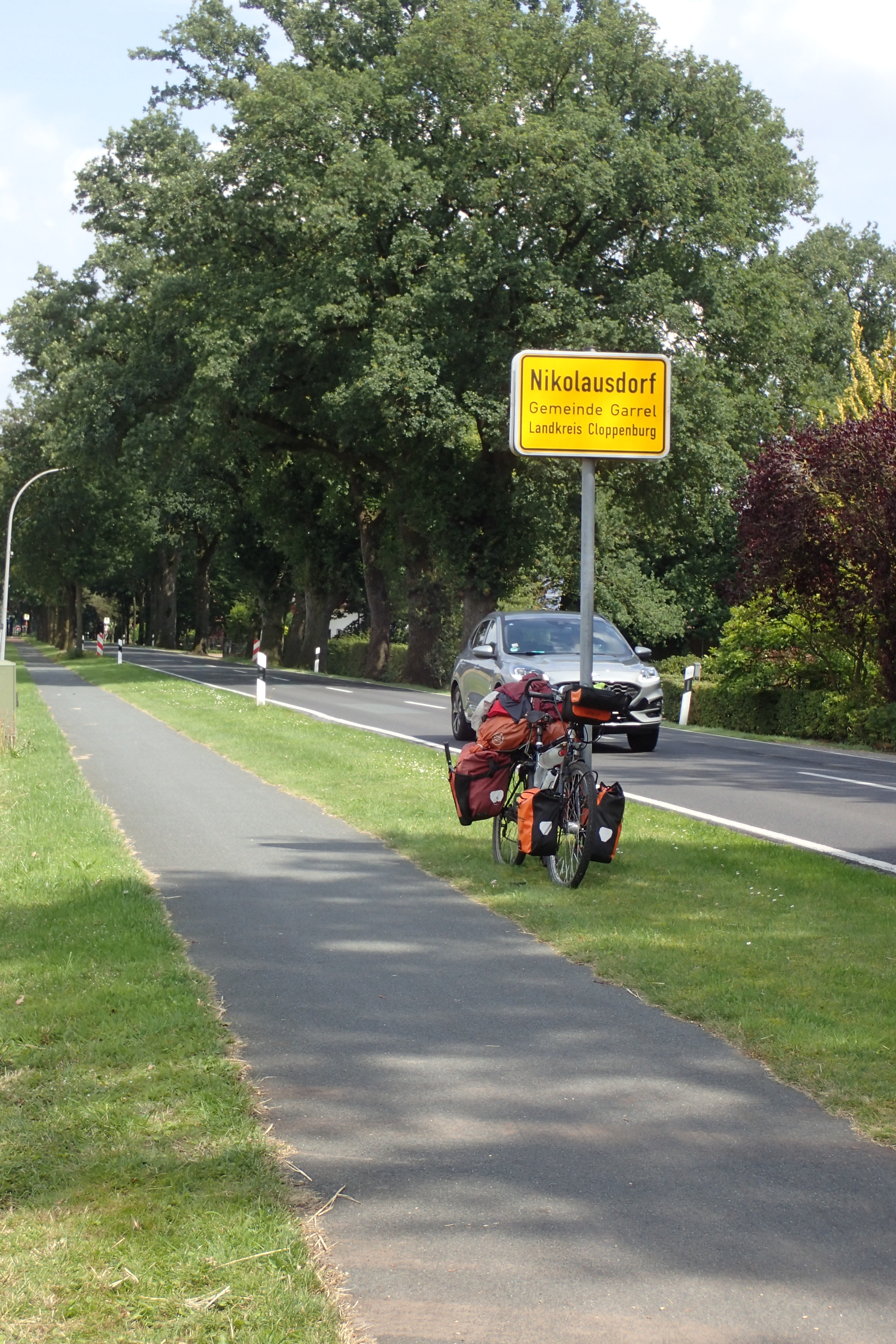 Die nasse Bekleidung von gestern ist über Nacht nicht trocken geworden. Aber bei der positiven Wettervorhersage ohne jeglichen Regen packte ich die feuchten Sachen als Stapel hinten auf mein Gepäck. Geplant hatte ich für eine Route von maximal 90km mit der Option, nach 70 km an Campingplätzen vorbeizufahren und früher den Tag beenden zu können. In der Innenstadt traf ich dann Addi aus Gieboldehausen, der sich nach dem Weg erkundigte und Richtung Oldenburg unterwegs war. Ich bot ihm an, mir auf dem Weg aus dDer Körper er Stadtzu folgen.So radelten wir die ersten ca 20km gemeinsam bevor er mehr Richtung Norden in Richtung Oldenburg abbog und ich Richtung Süden.