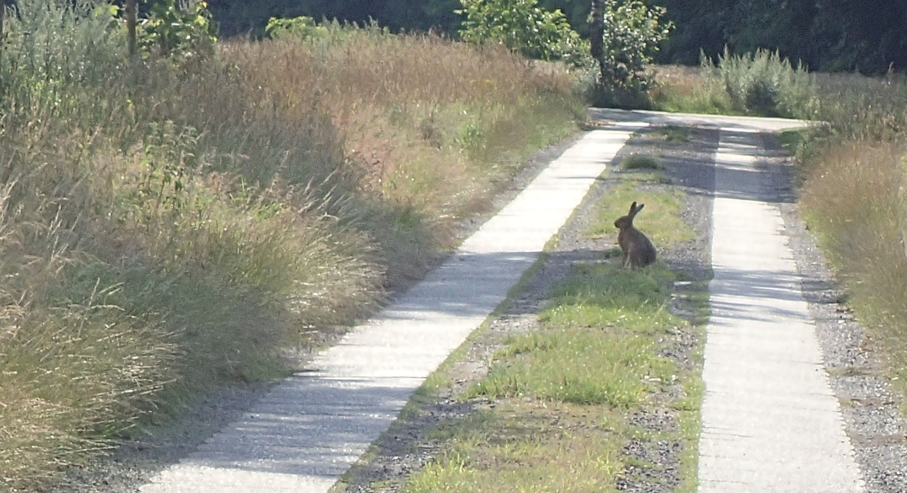 Auf den ruhigen landwirtschaftlichen Wegen habe ich heute ein Reh gesehen und den Hasen konnte ich sogar fotografieren. Das ist schon entspanntes Fahren. Aber die dörflichen Ortsdurchfahrten sind immer wieder anders gestaltet und als Radfahrer soll man (streng gemäß der ausgewiesenen Radwegebenutzungspflicht) auf 1-1,2m breiten Wegen Slalom um die Fußgänger und Mülltonnen fahren und an jeder Grundstücksausfahrt die Gefahr in Kauf nehmen, dass ein unbedarfter Verkehrsteilnehmer plötzlich den Radweg überfährt.