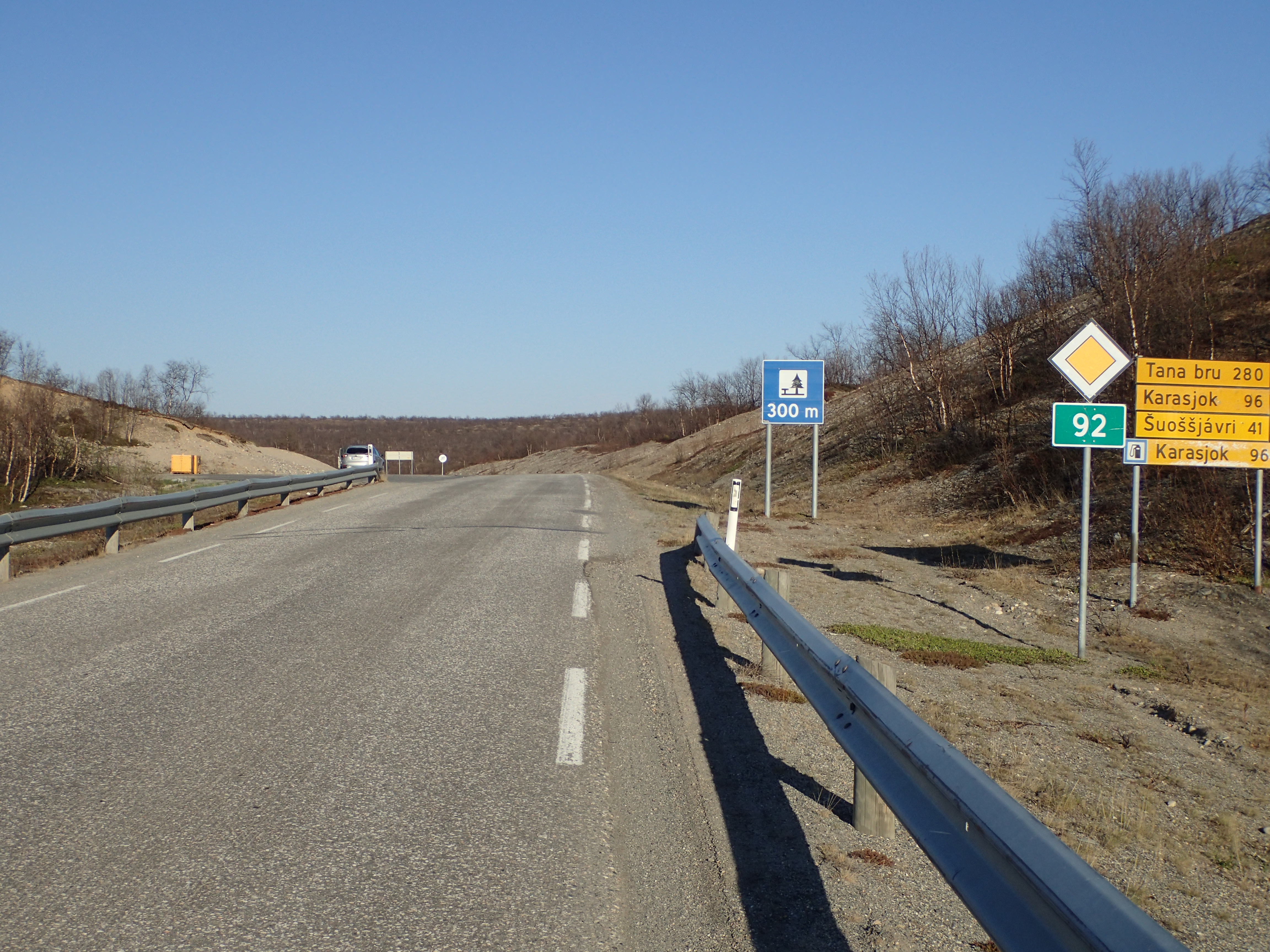 Die Landschaft ist mittlerweile sehr karg geworden. Es wachsen eigentlich nur noch kleine Birken auf den Flächen und Kiefern sind kaum noch zu sehen. Der Wind kam aus Ost-Nordost und somit meistens von vorne und war wieder sehr eisig. Die Straße ging zusätzlich häufiger auf und ab als an den letzten Tagen und so war es relativ anstrengend, wieder 100km zu radeln.