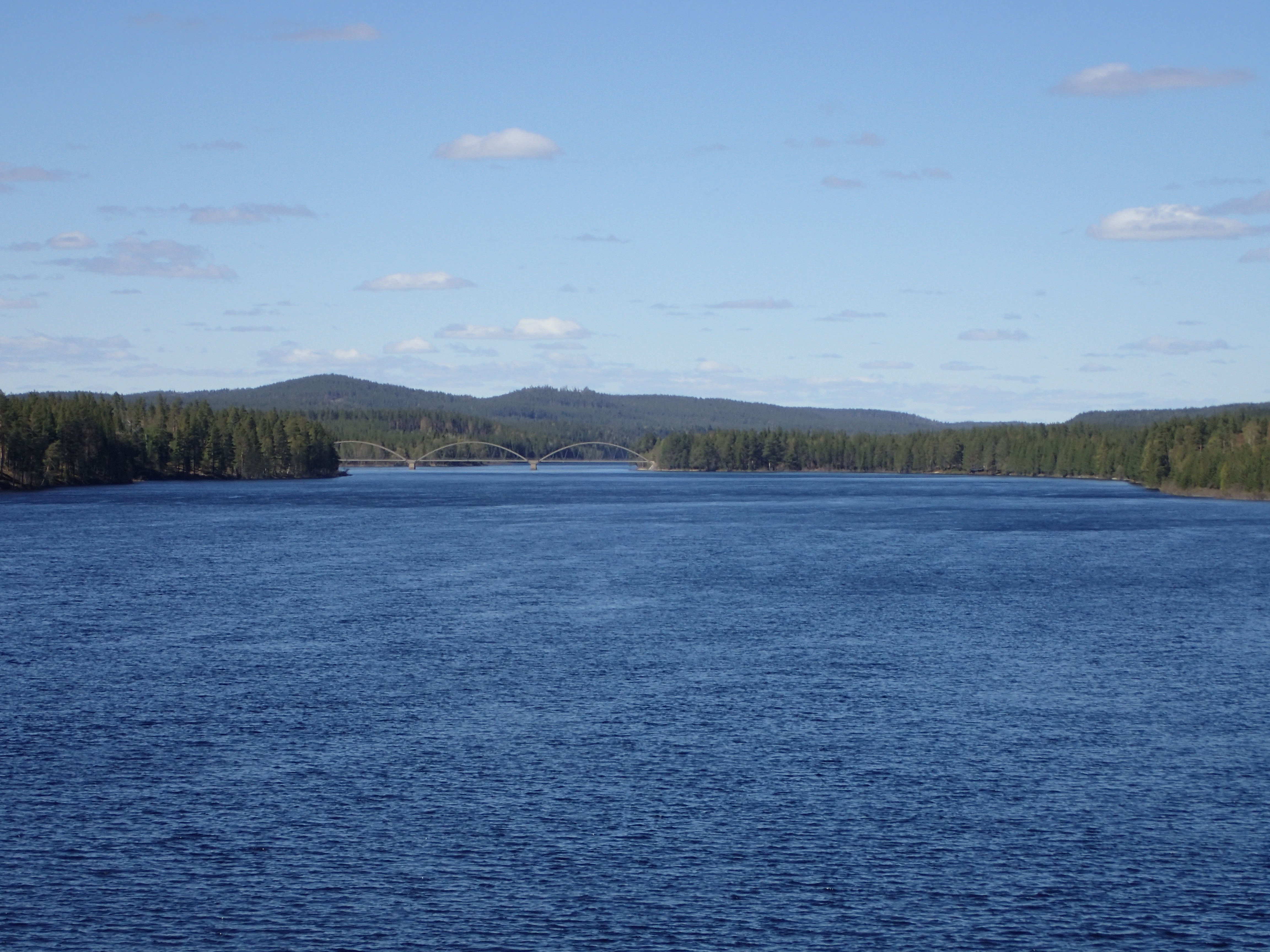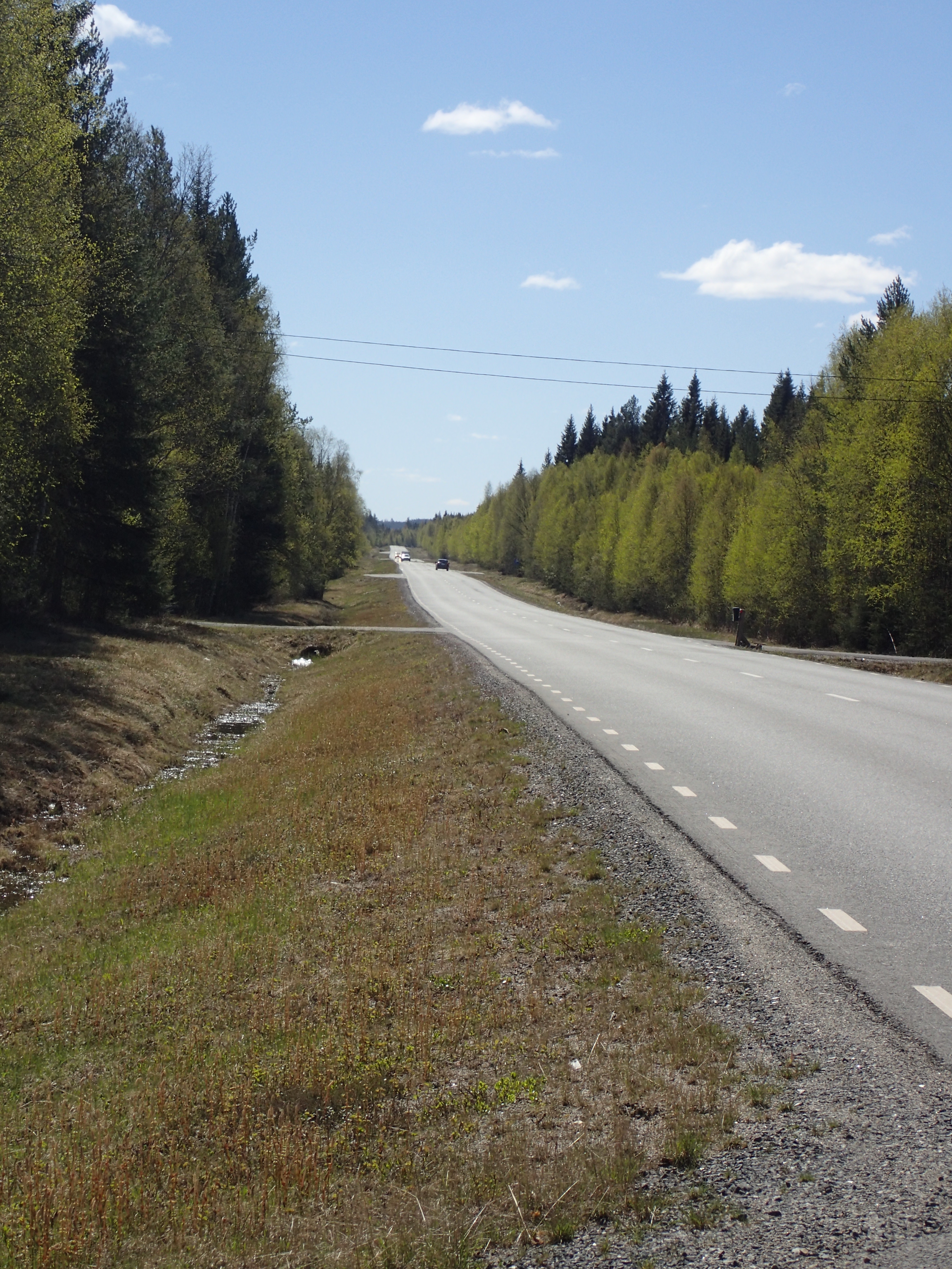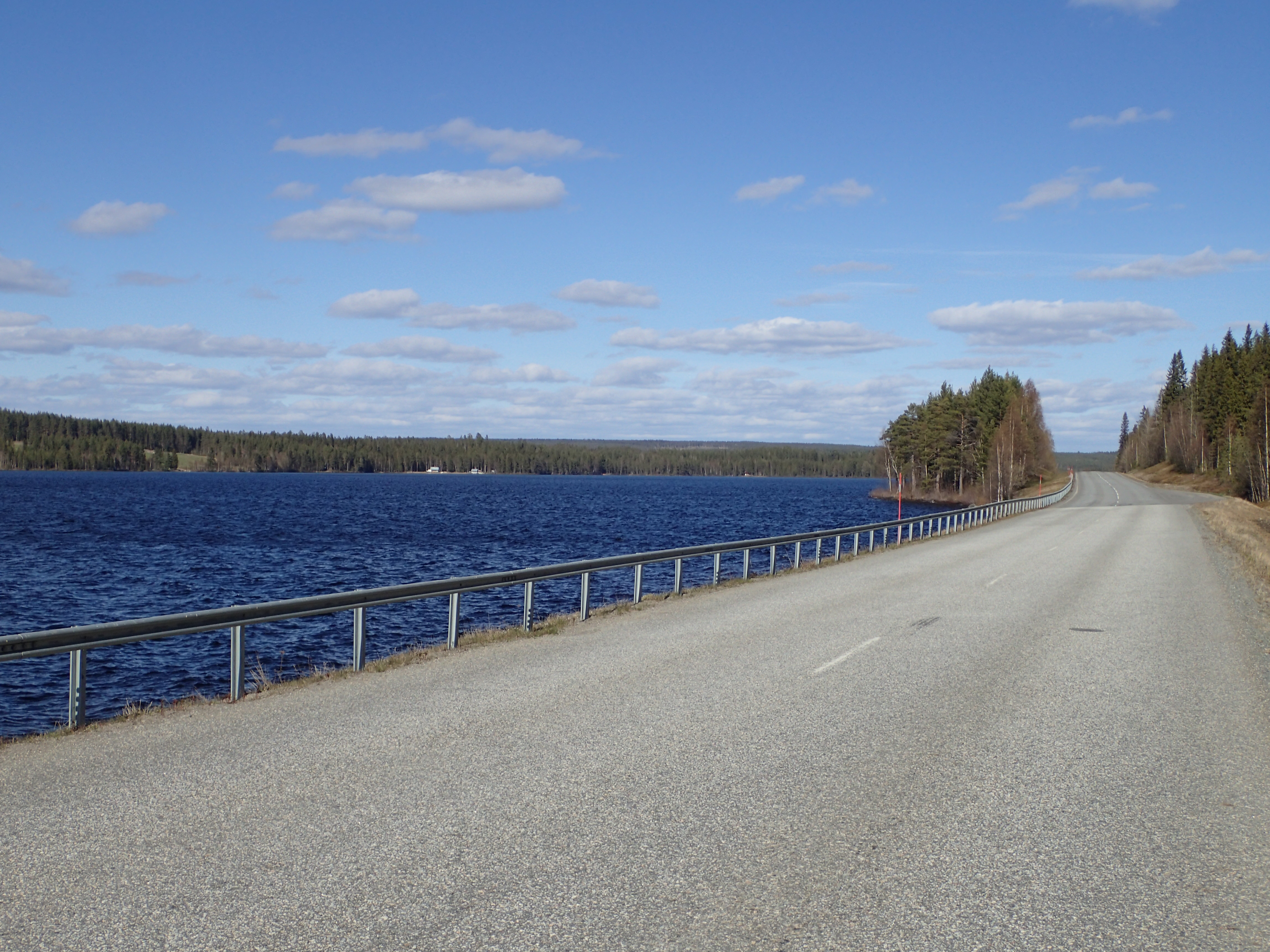 Da ich nachts spät mit Essen, Blog schreiben und Wäsche machen fertig geworden bin und es eine eisige Nacht werden sollte, bin ich spät aufgestanden. Alle Fotos von diesem Tag täuschen sehr über das von mir gefühlte Wetterempfinden. Es ist zwar sehr angenehm, wenn es nicht regnet, hagelt oder schneit, aber den ganzen Tag über ein eisiger Nordwind (meistens beim Fahren als Gegen- oder Seitenwind) ist schon sehr anstrengend. Nur im Windschatten und in der Sonne war es richtig angenehm warm. Offiziell lagen die Temperaturen über Tag zwischen 8 und 10°C. Durch die immer geringer werdende Besiedelung gibt es auf diesen Etappen auch immer weniger Abwechselung. Die Fotos zeigen etwas von der Landschaft hier. Immer wieder überquert die Straße kleine Bäche und auch größere Flußläufe. Für mich als aktiver Kanute stellt sich dann immer wieder die Frage, ob ich diese Bäche nicht auch mit dem Kajak befahren kann. Beim Foto 8 vom Uferstreifen des Vindelälven fällt mir auf, dass die Kiefern im Wasser stehen. Das ist für mich ein Zeichen, dass der Vindelälven Hochwasser führt.