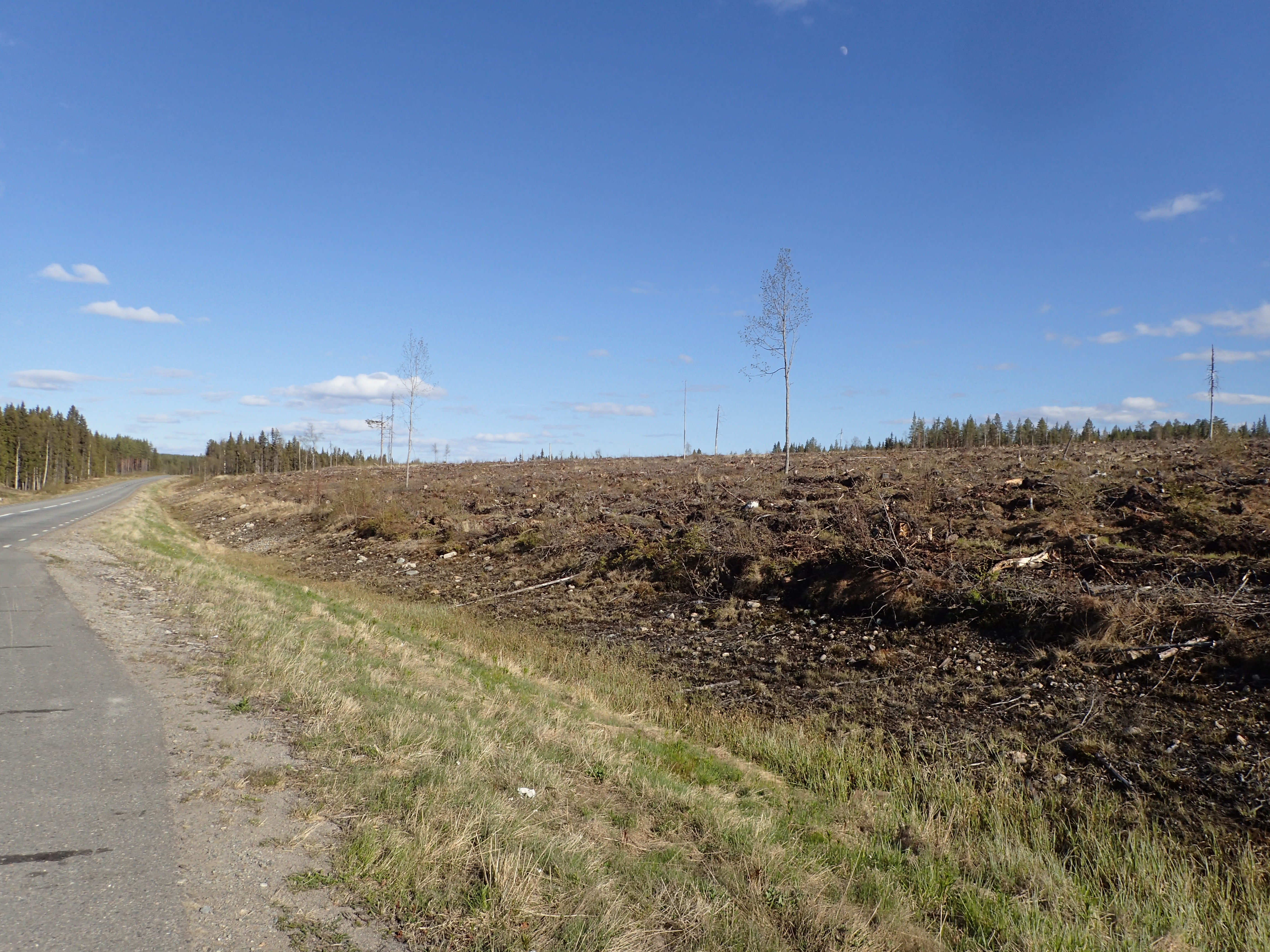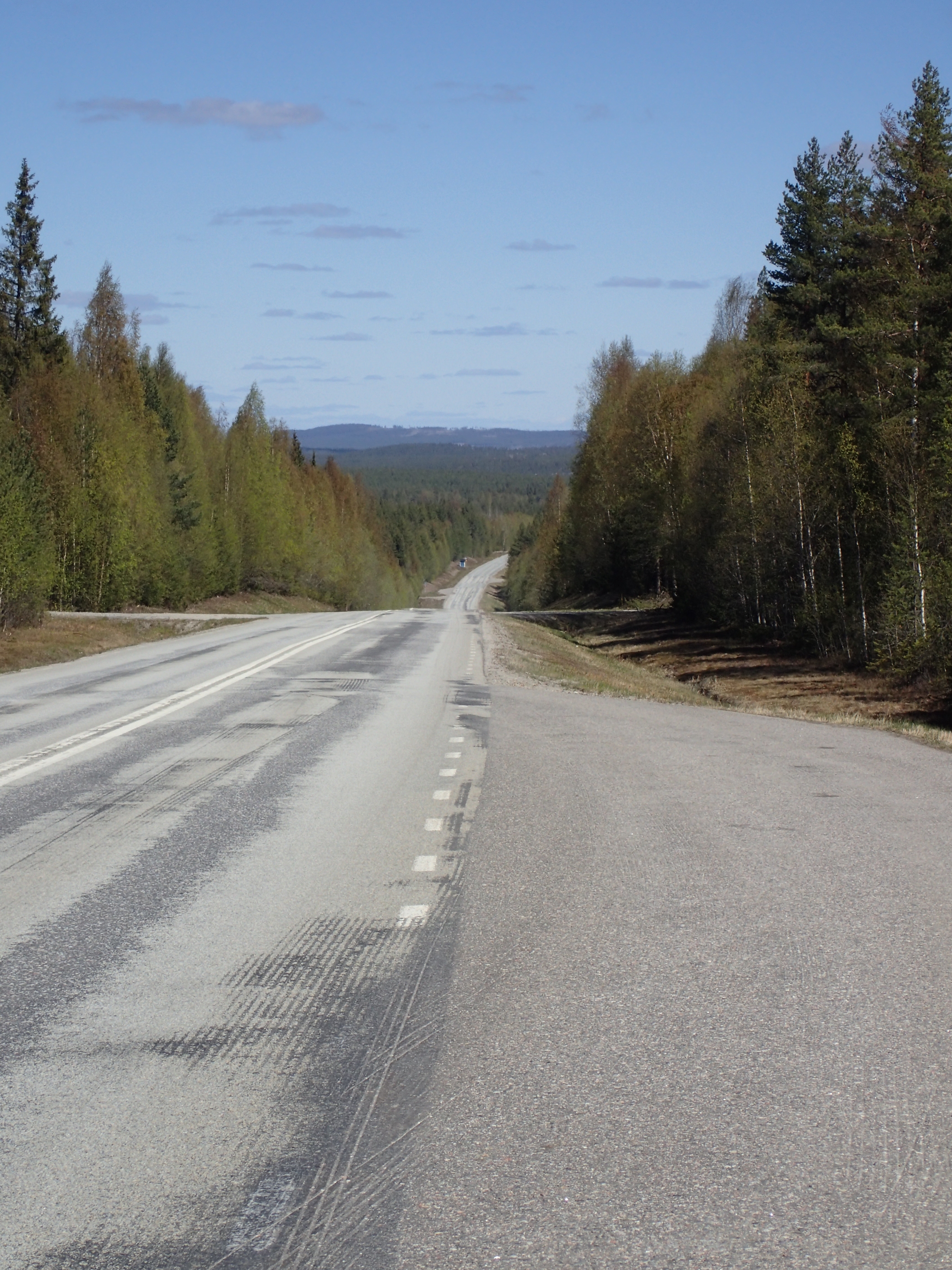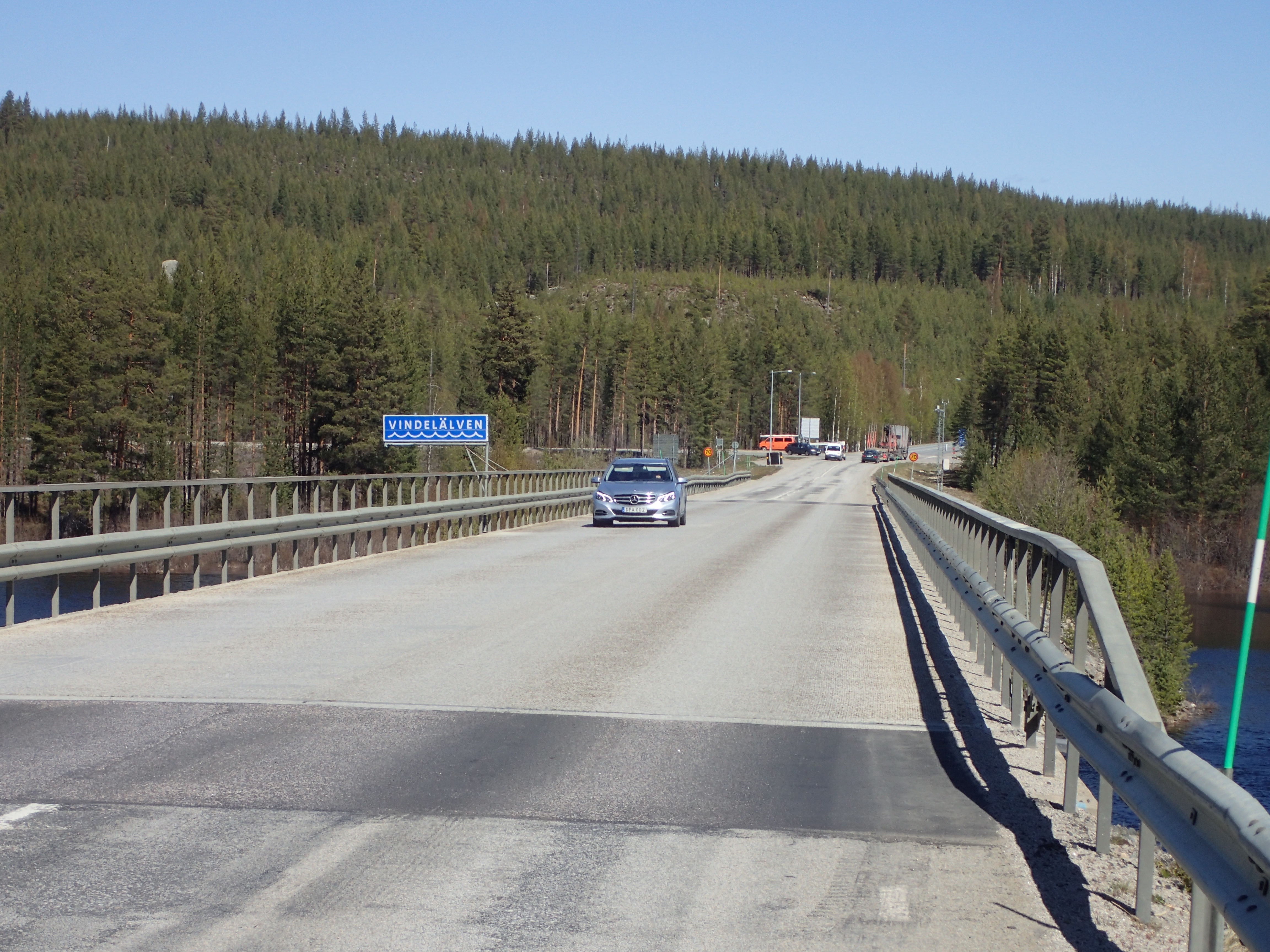 Da ich nachts spät mit Essen, Blog schreiben und Wäsche machen fertig geworden bin und es eine eisige Nacht werden sollte, bin ich spät aufgestanden. Alle Fotos von diesem Tag täuschen sehr über das von mir gefühlte Wetterempfinden. Es ist zwar sehr angenehm, wenn es nicht regnet, hagelt oder schneit, aber den ganzen Tag über ein eisiger Nordwind (meistens beim Fahren als Gegen- oder Seitenwind) ist schon sehr anstrengend. Nur im Windschatten und in der Sonne war es richtig angenehm warm. Offiziell lagen die Temperaturen über Tag zwischen 8 und 10°C. Durch die immer geringer werdende Besiedelung gibt es auf diesen Etappen auch immer weniger Abwechselung. Die Fotos zeigen etwas von der Landschaft hier. Immer wieder überquert die Straße kleine Bäche und auch größere Flußläufe. Für mich als aktiver Kanute stellt sich dann immer wieder die Frage, ob ich diese Bäche nicht auch mit dem Kajak befahren kann. Beim Foto 8 vom Uferstreifen des Vindelälven fällt mir auf, dass die Kiefern im Wasser stehen. Das ist für mich ein Zeichen, dass der Vindelälven Hochwasser führt.