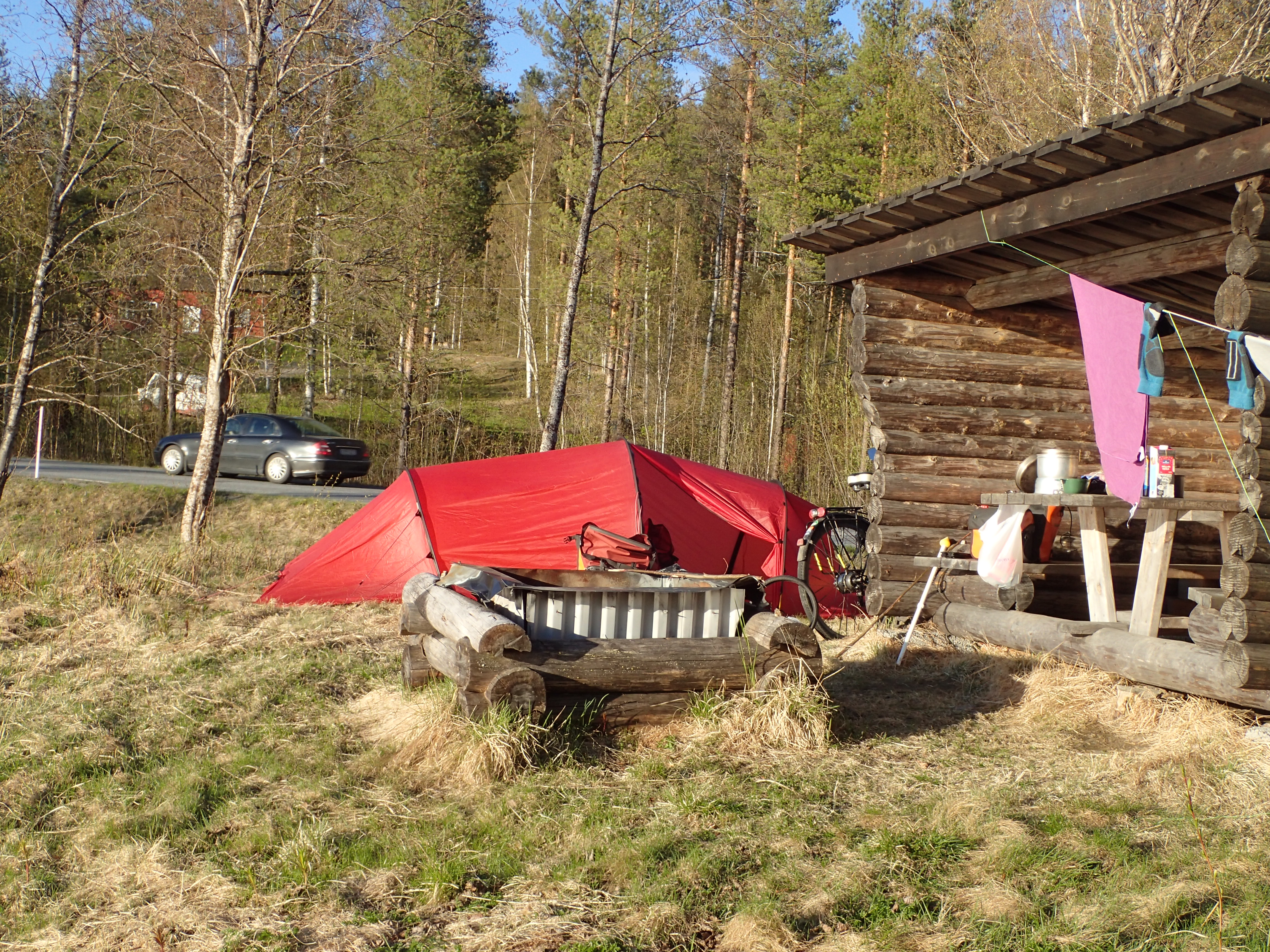 Heute habe ich überhaupt nicht nach einem Zeltplatz gesucht. Nachdem die 100km erreicht waren wollte ich ab 19:30 Uhr nach einem Platz suchen. Dieser Platz liegt jetzt zwar direkt neben der Straße, aber mit Blick auf einen kleinen See, über dem am anderen Ende die Sonne untergegangen ist. In der kleinen, halboffenen Schutzhütte hatte ich dann meine Campingküche aufgebaut. Es gab wieder Nudeln mit fertiger Pastasoße, eine Dose Bier und zum Nachtisch Filmjölk, eine spezielle schwedische Sauermilch, mit Waldbeeren (fertig vom ICA).