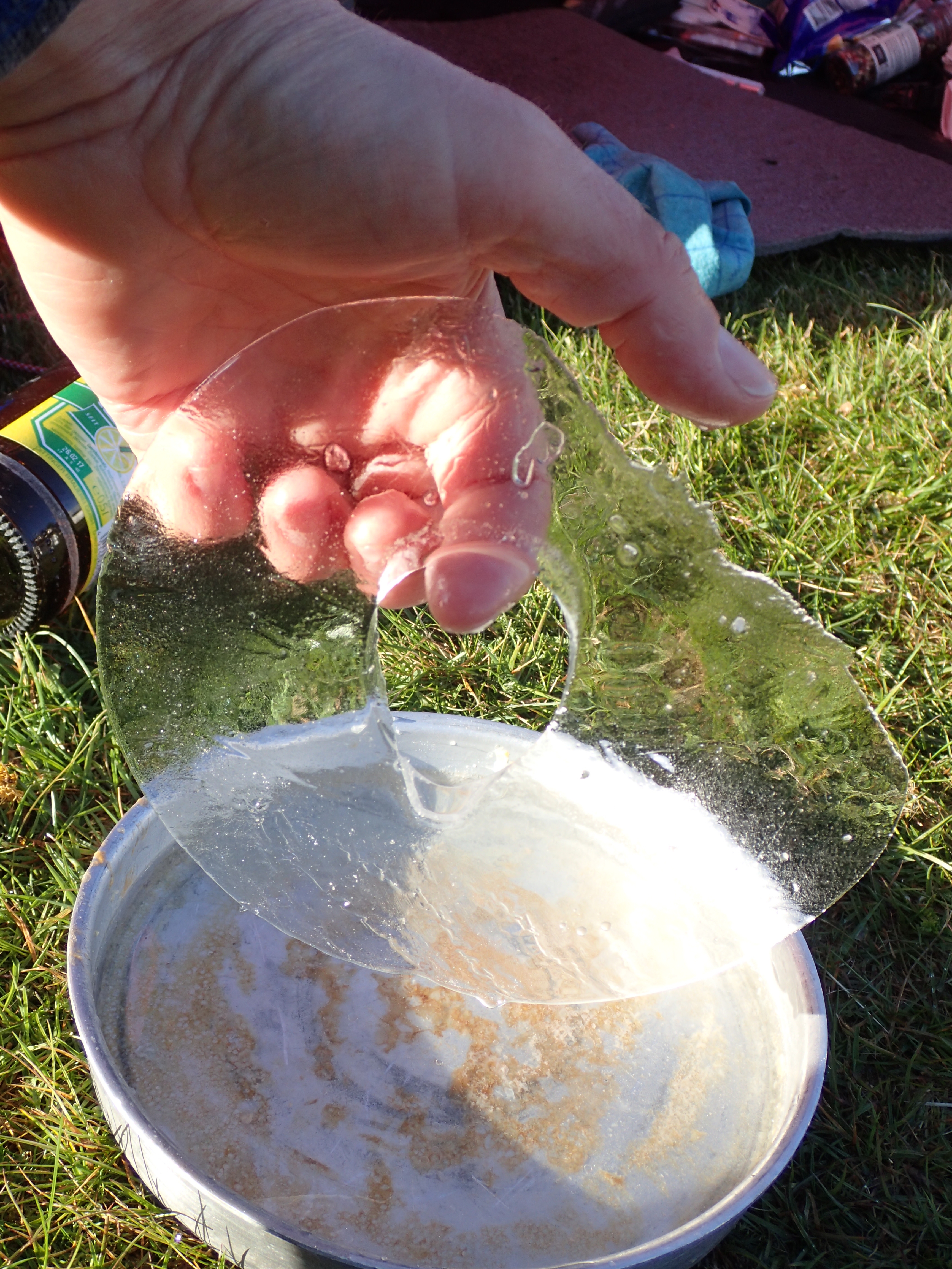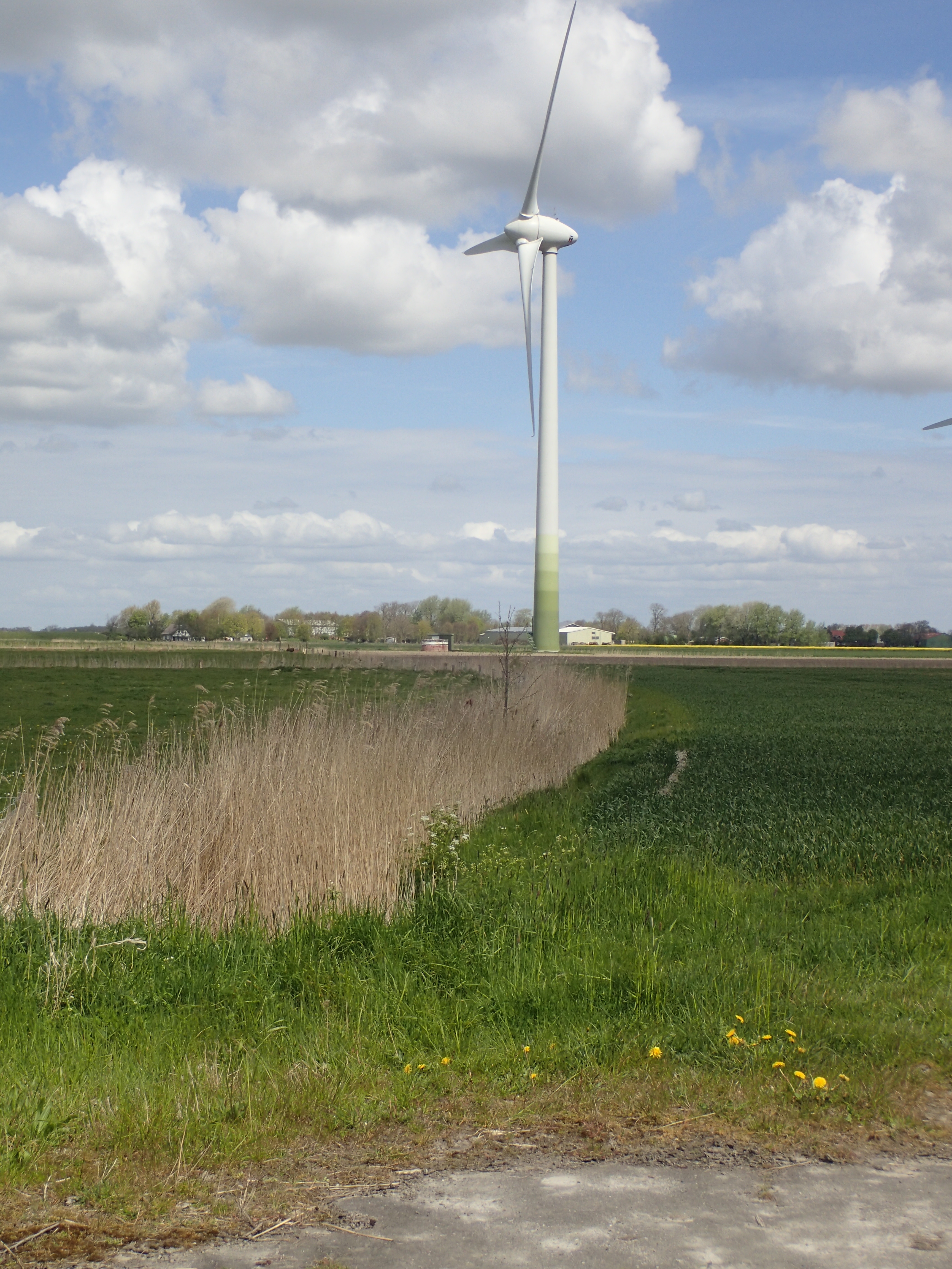 Heute morgen war es sehr kalt. Die Wettervorhersage hatte für die letzte Nacht 1°C vorhergesagt, aber es waren vermutlich eher -3° bis -1° C. Aber in meinem Ajungilak (by Mammut)-Schlafsack, der bis ca. 0°C vorgesehen ist, habe ich gut geschlafen. Zusätzlich Socken angezogen, die Faserpelzjacke in das Fußende des Schlafsacks geschoben, um die Füße zu wärmen und auf dem Kopf ein Schurwoll-„Baff“. Obwohl die Sonne schon aufgegangen war gegen 7:00 Uhr morgens, war im Schatten des Wohnwagens um das Zelt herum noch der Rauhreif zu sehen und das Wasser, welches ich abends in die Pfanne zum Einweichen eingefüllt hatte, war an der Oberfläche gefroren. (3.Foto) Die Sonne hatte aber ordentlich Kraft und das Zelt mit der Unterlage konnte ich so trocken wie lange nicht mehr einpacken. Der Campingplstz liegt direkt neben dem Sportflugplatz und das Foto zeigt die Windmühlen in Richtung Westen in Dithmarschen. Direkt nach dem Start führte mich der Naviki-Track über einen schmalen Wanderweg am Flugplatz entlang. Das war aber noch eine akzeptable Abkürzung. (Foto 5) Danach ging es bei herrlichem Sonnenschein (und etwas kalten Seiten- bzw. Gegenwind) Richtung Tönning. Wer die Cyclemeter-Statistik genauer ansieht, wird feststellen, dass ich recht schnell fahren musste, da ich zwischen 12:00 und 13:00 Uhr in Tönning mit meiner Frau zum Essen verabredet war. Das habe ich aber noch geschafft. Meine Frau fährt ja bereits morgen, am 10. Mai mit dem Auto Richtung Norwegen.